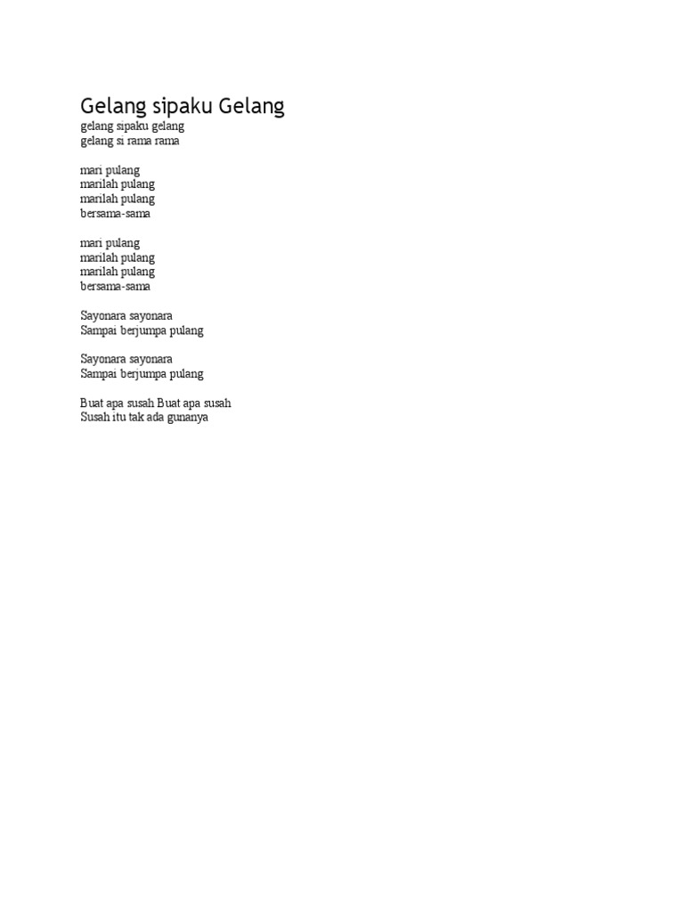 Lirik dan Chord Lagu Daerah Sumatra Barat Gelang Sipaku Gelang. Gelang sipaku gelang Gelang sipaku gelang Gelang sirama rama Gelang sipaku gelang Gelang sirama rama Mari pulang Marilah pulang Marilah pulang Bersama-sama Mari pulang Marilah pulang Marilah pulang Bersama-sama. Sayonara sayonara Sampai berjumpa pula.